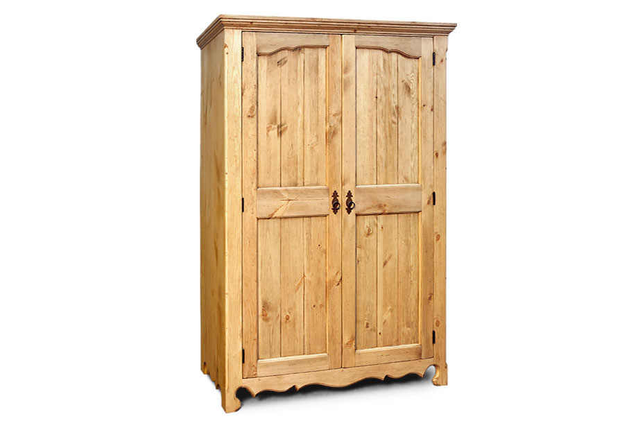 Двустворчатый гардеробный деревянный шкаф в стиле рустика. Фрезеровкой украшены карниз и основание корпуса, дверцы в филенках с ручками-кольцами.