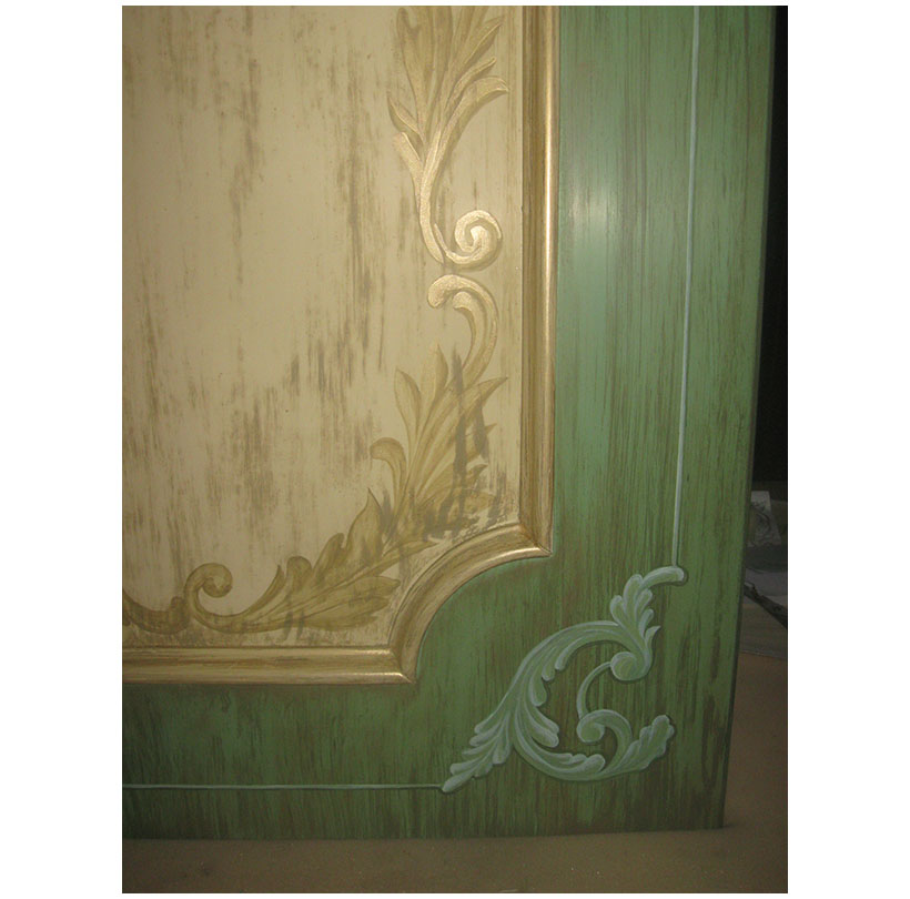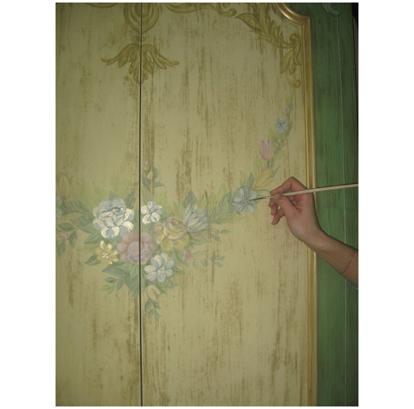 Оригинальный вместительный шкаф выполнен в изящном классическом стиле. Фасад модели искусственно состарен для усиления эффекта уникальности и антикварной ценности изделия. Конструкция разделена на две большие секции, оборудованные двустворчатыми дверцами. Поверхность дверец украшена ручной художественной росписью. Данный шкаф станет ярким дополнение для любого классического интерьера.