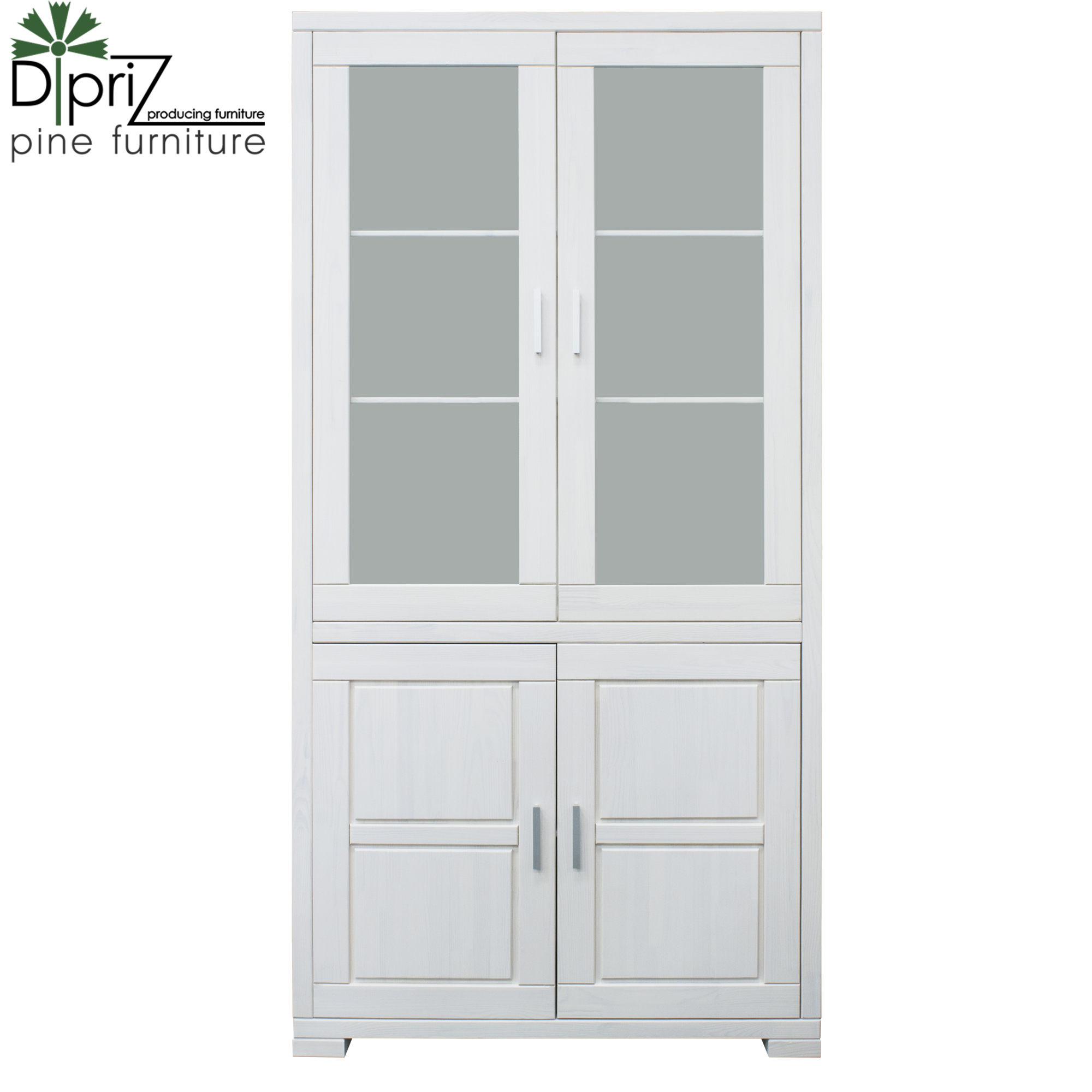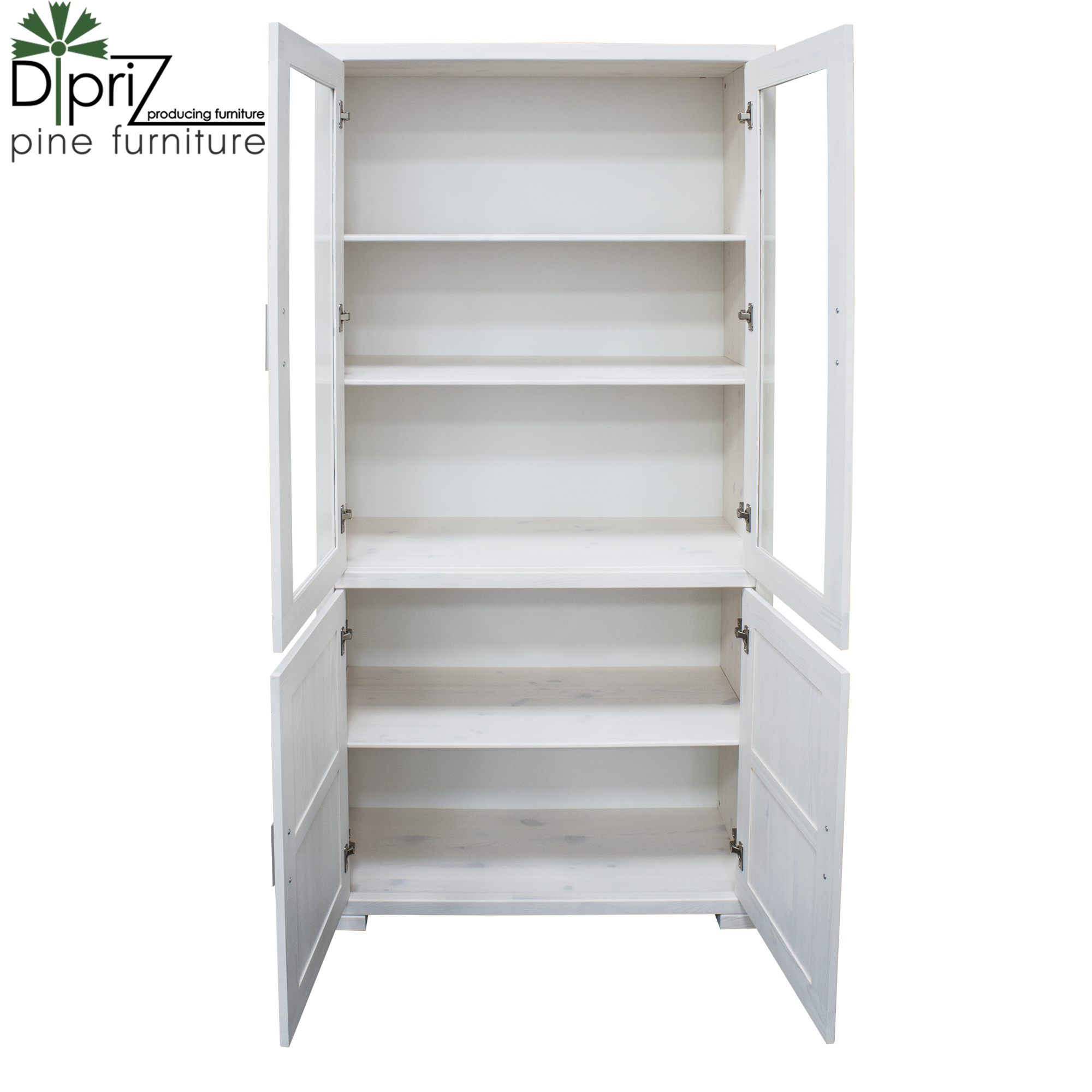 Витрина 2 распашные двери (стеклянная дверь, внутри 2 полки) вверху, и 2 распашные двери внизу (филенка, внутри 1 полка).