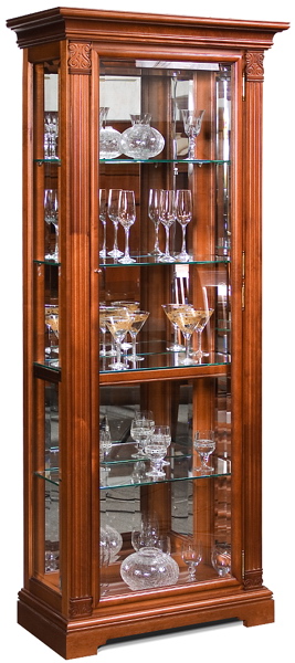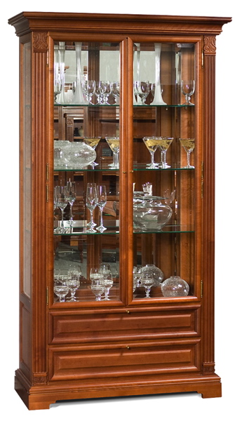 Колоновидная витрина на три стеклянные полки для сервиза, остекленная с трех сторон и с зеркальной задней стенкой. Внизу обустроен блок с двумя выдвижными ящиками. Шкаф может быть выполнен в цвете: мокко, белый орех и слоновая кость. Он богато украшен резными декоративными элеменами и филенками.