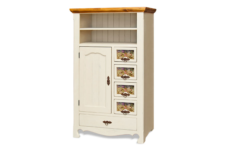 Невысокий деревянный шкаф-комод с открытой нишей на две полки, пятью выдвижными ящиками и отделом на распашной дверце. Корпус отделан в белой эмали, контрастная крышка лакирована в натуральном цвете.