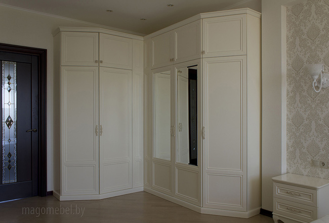 Угловой шкаф из массива оснащен зеркальными вставками на двух створках и рядом распашных дверок. Имеется ярус с антресолью. Створки украшены аккуратными и изящными ручками. Крупная конструкция со скошенными углами органично вписывается в угол комнаты и визуально не сильно уменьшает имеющееся пространство.