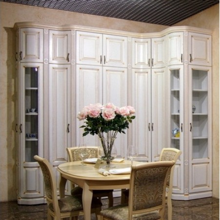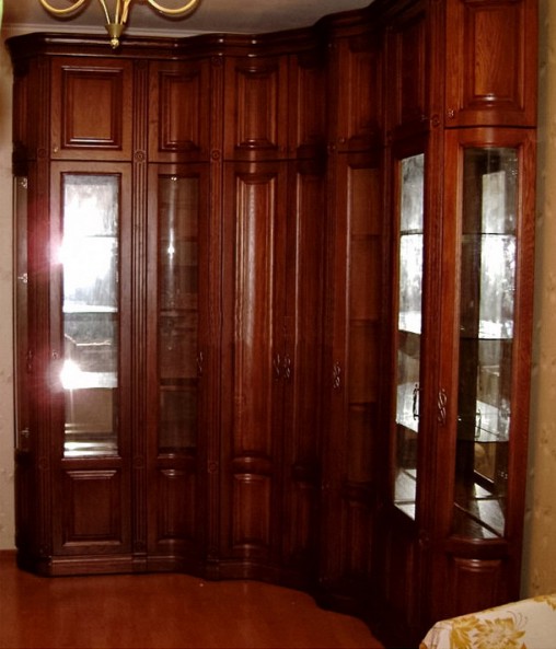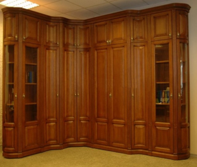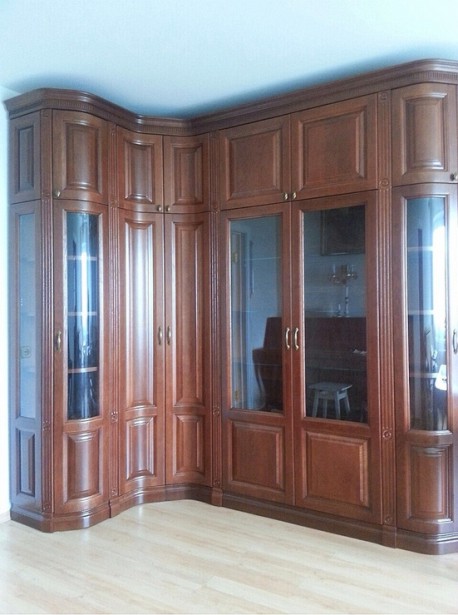 Представленный угловой шкаф из массива дуба имеет глухие створки и небольшое остекление торцевых сторон. Натуральный материал придает гарнитуру внушительный и благородный внешний вид. Шкаф из массива может быть выполнен в 14 различных цветовых вариациях.