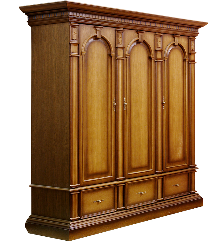 Трехдверный платяной шкаф для спальни. Фасад с резным карнизам, пилястрами и арочными филенками, под дверцами расположены три шуфляды на массивном основании.