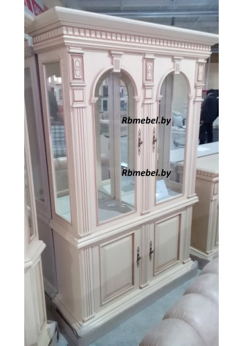 Буфет из массива дерева с резным светлым фасадом в стиле Ренессанс. Две дверцы в арочных рамах, зеркальная тыльная стенка и стеклянные полки. Нижний отдел на дверцах с филенками. Миниатюрные ручки-кнопки под бронзу.
