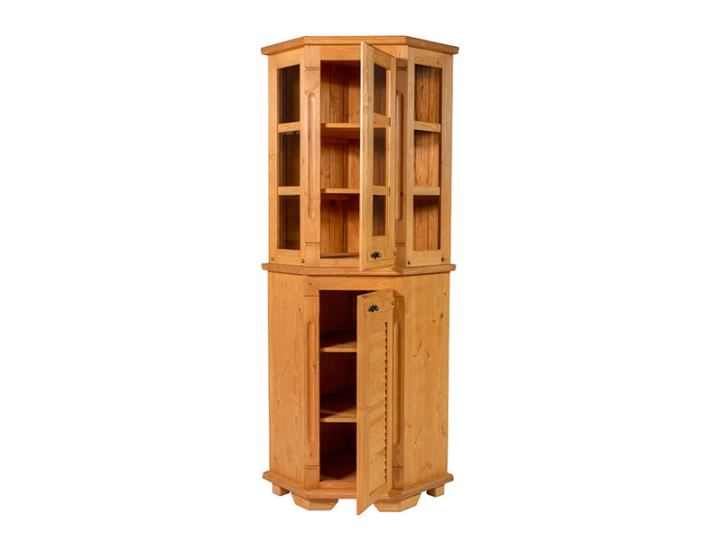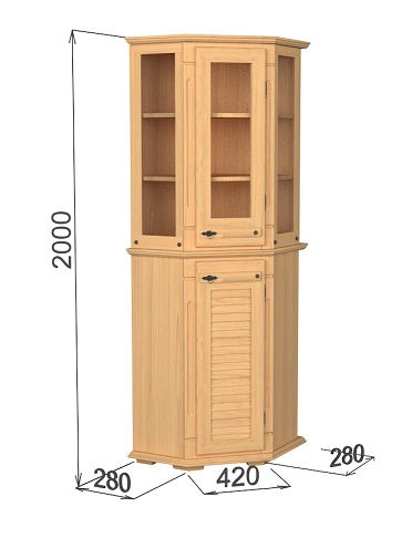 Шкаф-витрина обладает угловой конструкцией, станет отличным дополнением в классический интерьер. Внутри установлены полки, корпус шкафа может быть окрашен в любой цвет, согласно ассортименту.