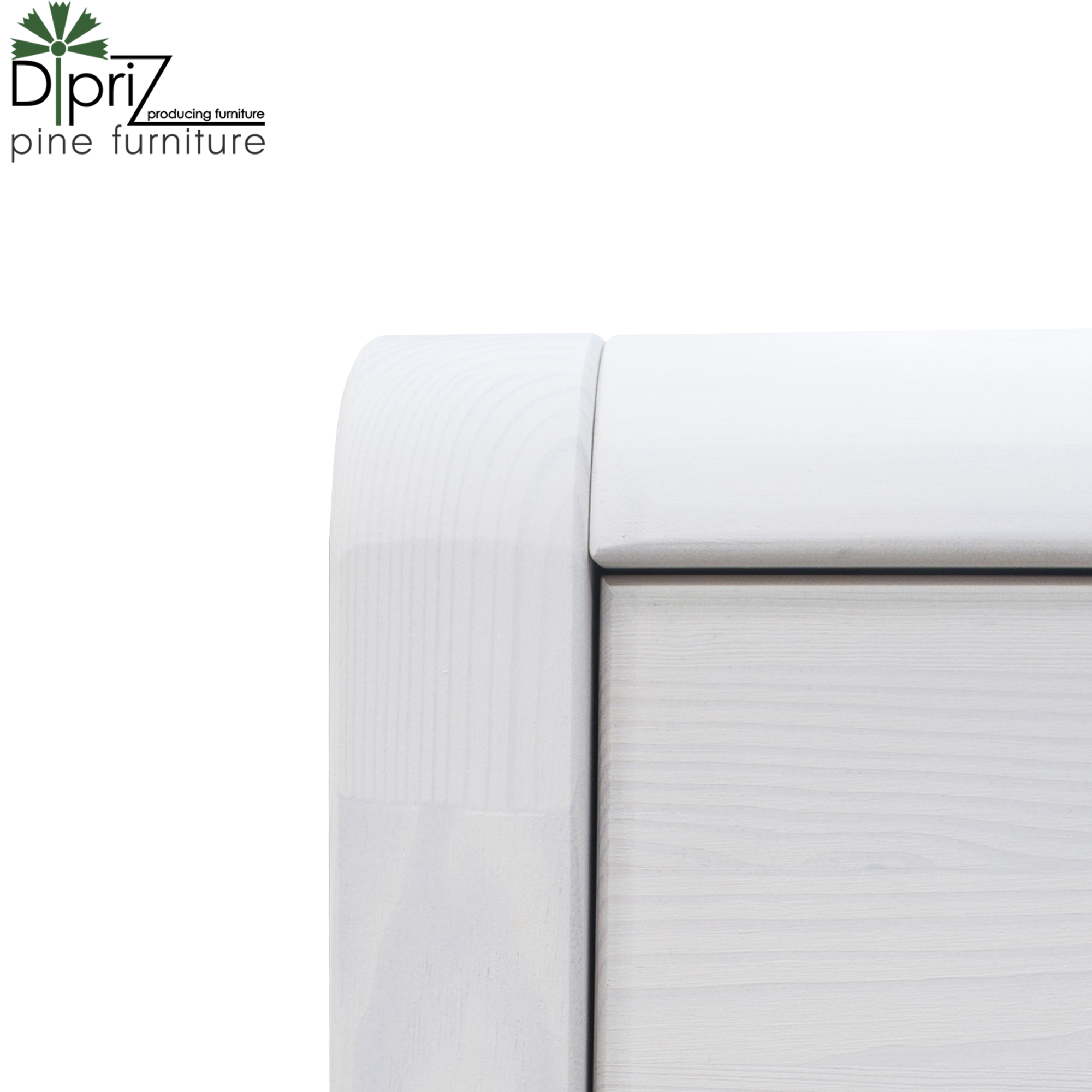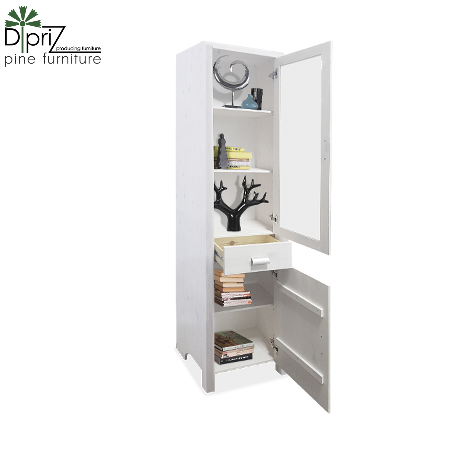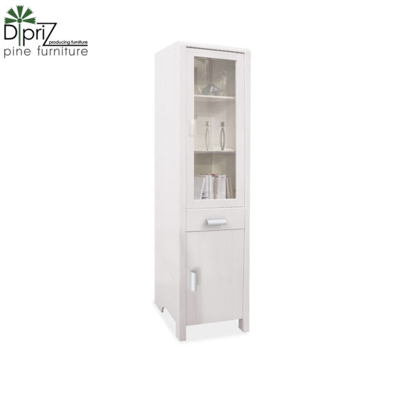 Стеллаж «Мадейра» из массива сосны окрашен в цвет «белый воск». Верхняя секция модели представлена двумя деревянными полками, закрывающими створкой с стеклянной вставкой. В центре конструкции имеется выдвижной ящик. Нижняя секция оснащена полкой, которая прячется за деревянной дверцей.
