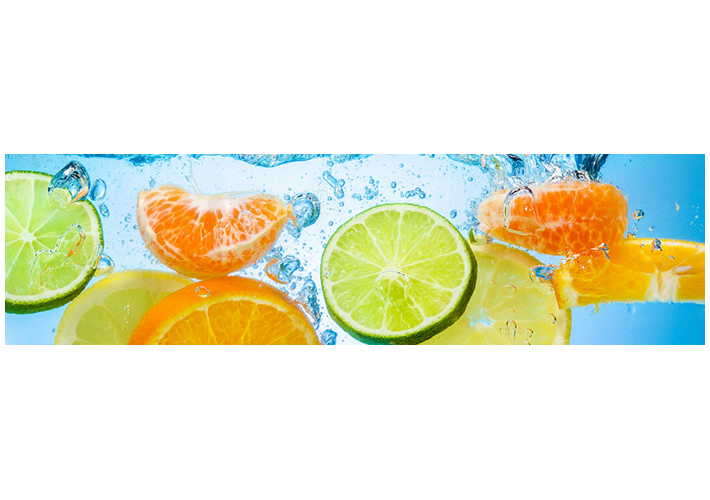 Во время летнего зноя, глядя на такое панно, вы мысленно перенесетесь в освежающую прохладу. Изображение фруктов в воде на кухонном фартуке будут превосходно гармонировать со светлым или зеленоватым фасадом кухни.