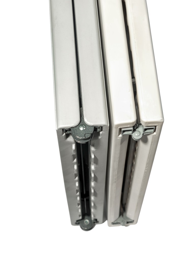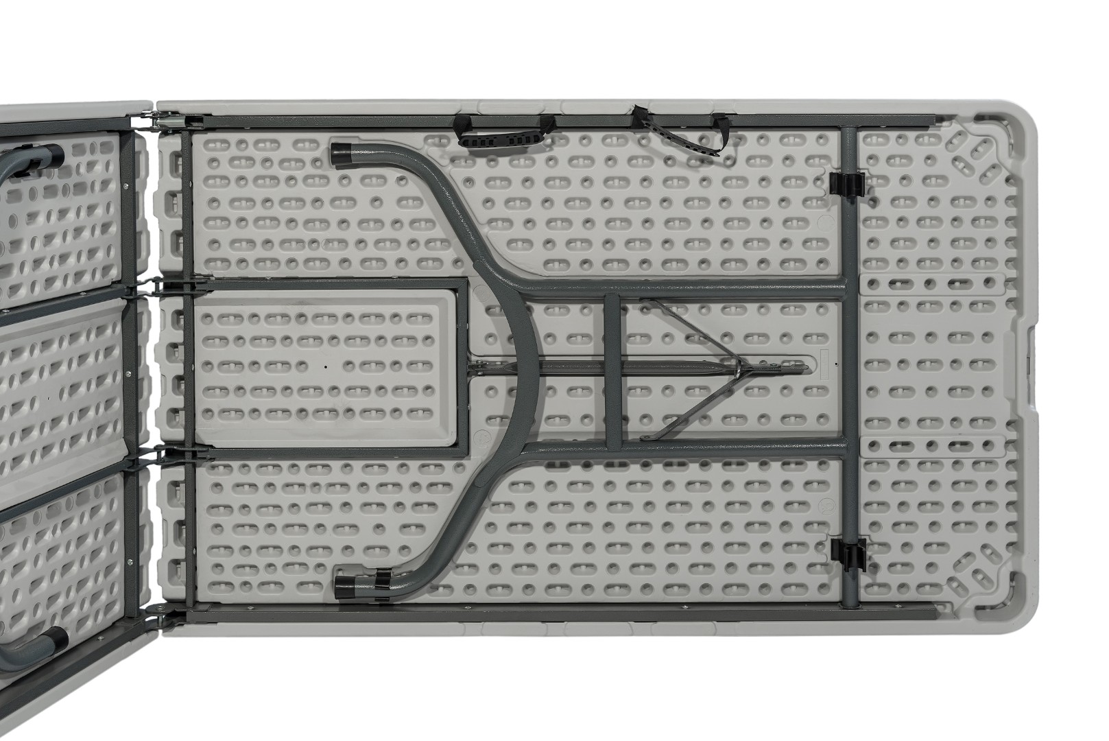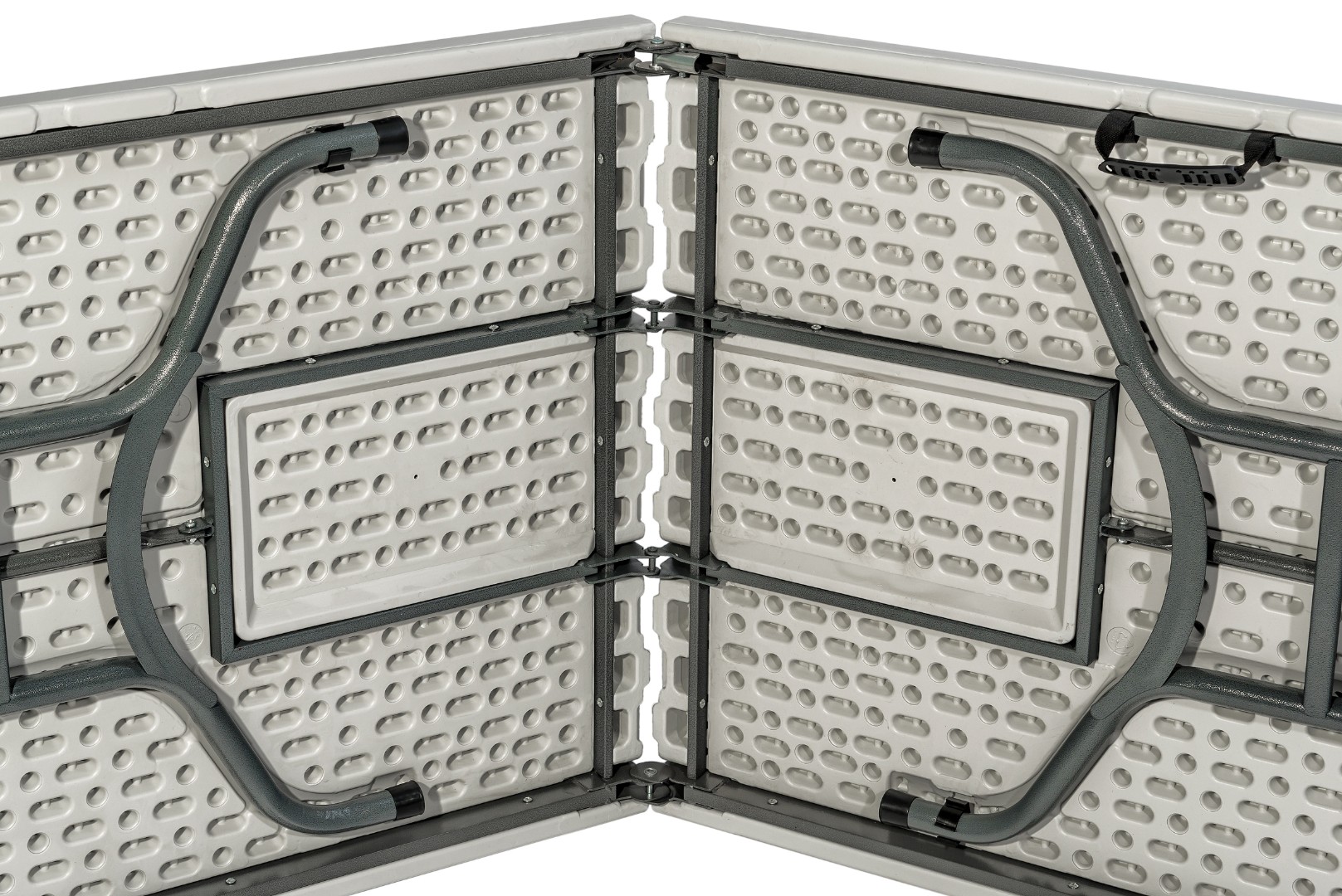 Пластиковая столешница белого цвета. Удобный механизм раскладки.