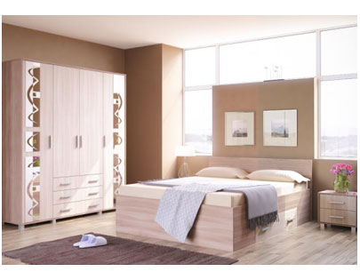 Сдвижные крышки на мини-секциях прикроватных тумб и туалетных столиков. Радиусные фасады шкафа. Цена за кровать шириной 1400 мм.