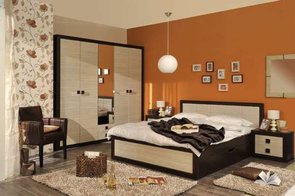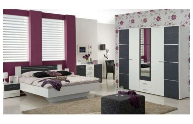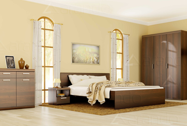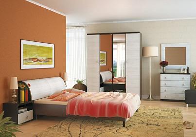 Кровать с основанием на ножках, трехдверный шкаф с зеркалом, две прикроватные тумбы.