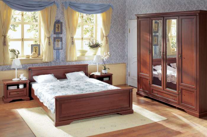Классический дизайн. Двуспальная кровать, платяной шкаф, две прикроватные тумбочки.