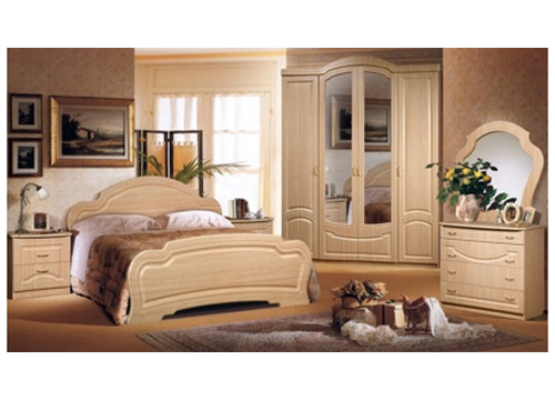 В комплект спального гарнитура входит шкаф для одежды, зеркало, 2 тумбы прикроватные, комод и кровать.