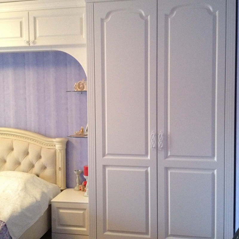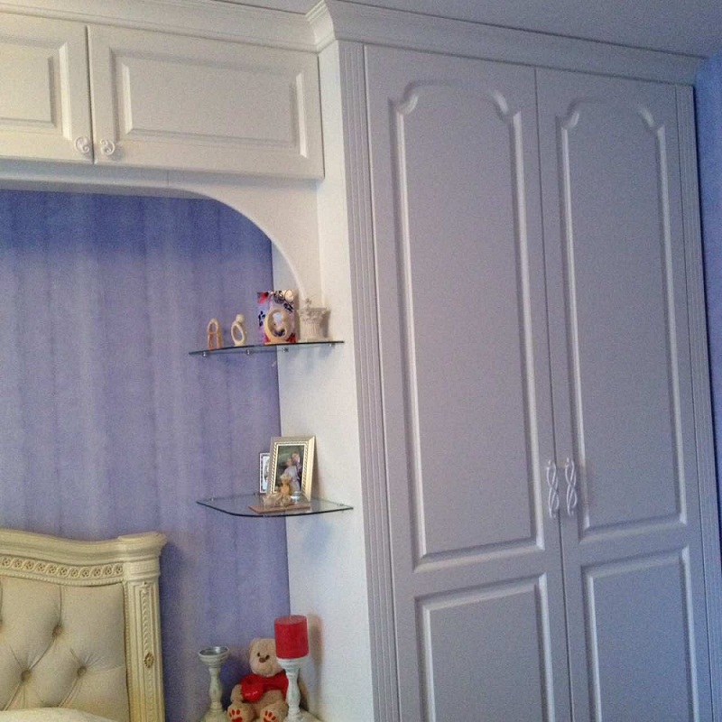Элегантный белый спальный гарнитур в классическом стиле. Симметричность интерьера устанавливается за счет двух распашных платяных шкафов, соединенных антресолью и образующих тем самым арку для размещения двуспальной кровати и тумб. Пространство арки дополнено угловым стеклянными полками. Фасады украшены филенками, круглыми и изгибистыми ручками. Фигурные спинки кровати декорированы резьбой, рисунком и мягкими вставками в каретной стяжке.
