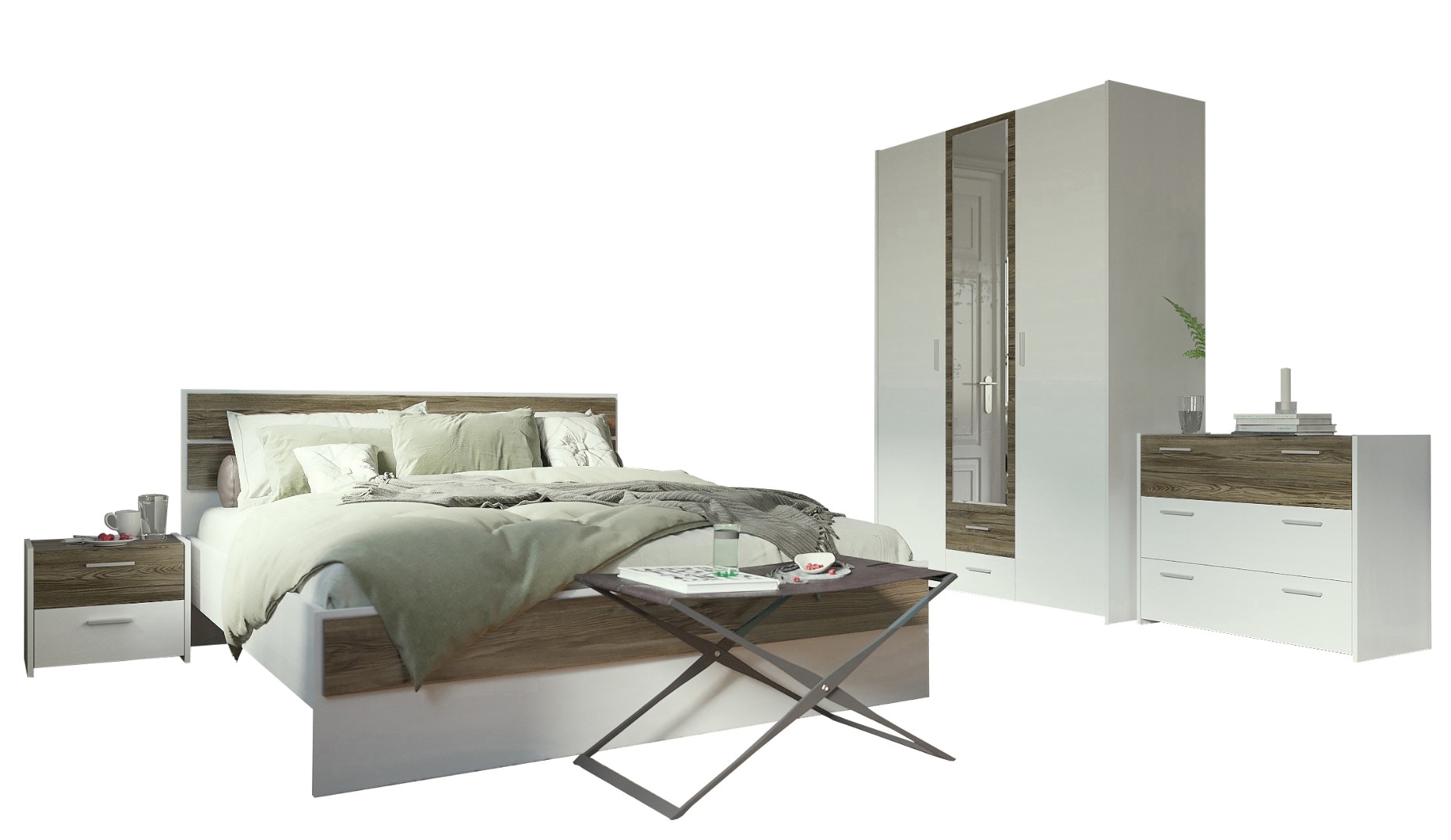 Этот спальный гарнитур смотрится очень уютно благодаря вставкам деревянных оттенков. Подойдет для любых помещений как темных, так и светлых. В составе все необходимые элементы: широкая кровать , две прикроватные тумбы, комод, вместитльный шкаф с зеркалом. Матрас не входит в комплектацию, приобрести его можно здесь