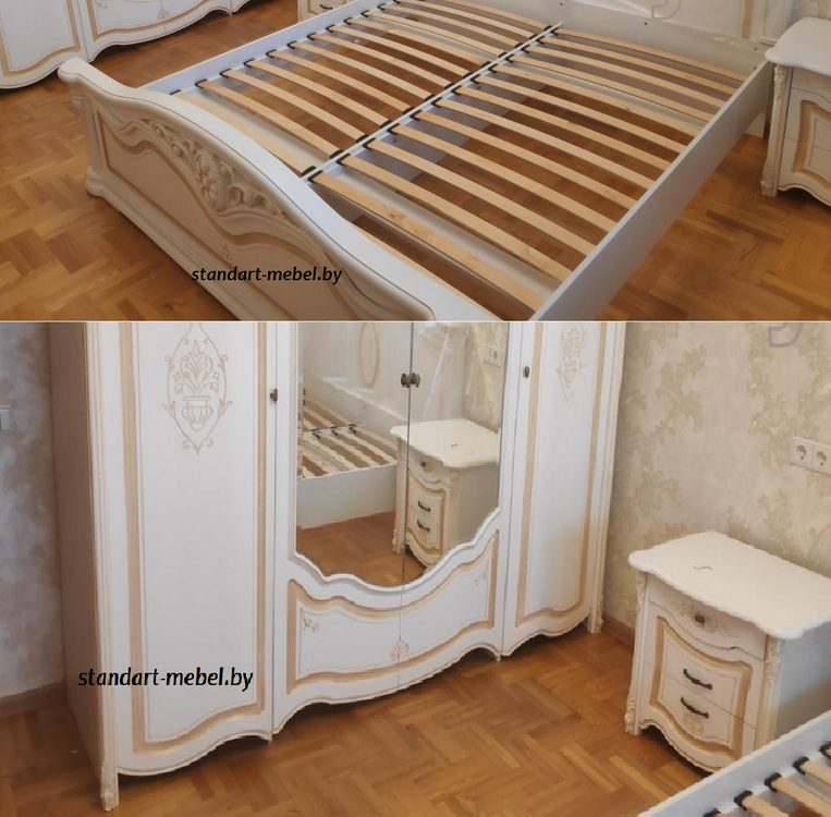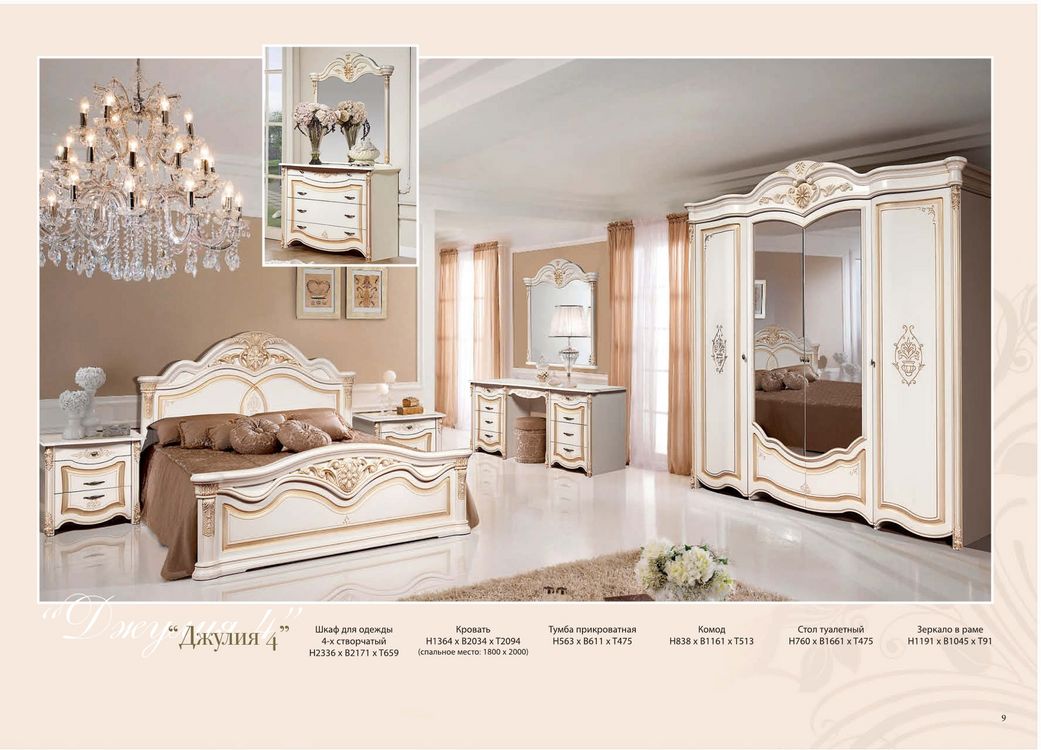 Спальня «Джулия» с туалетным столиком порадует ценителей классики. Особенно эффектно спальня смотрится в нежных сливочных оттенках, особый тон которым придает золотистая патина.