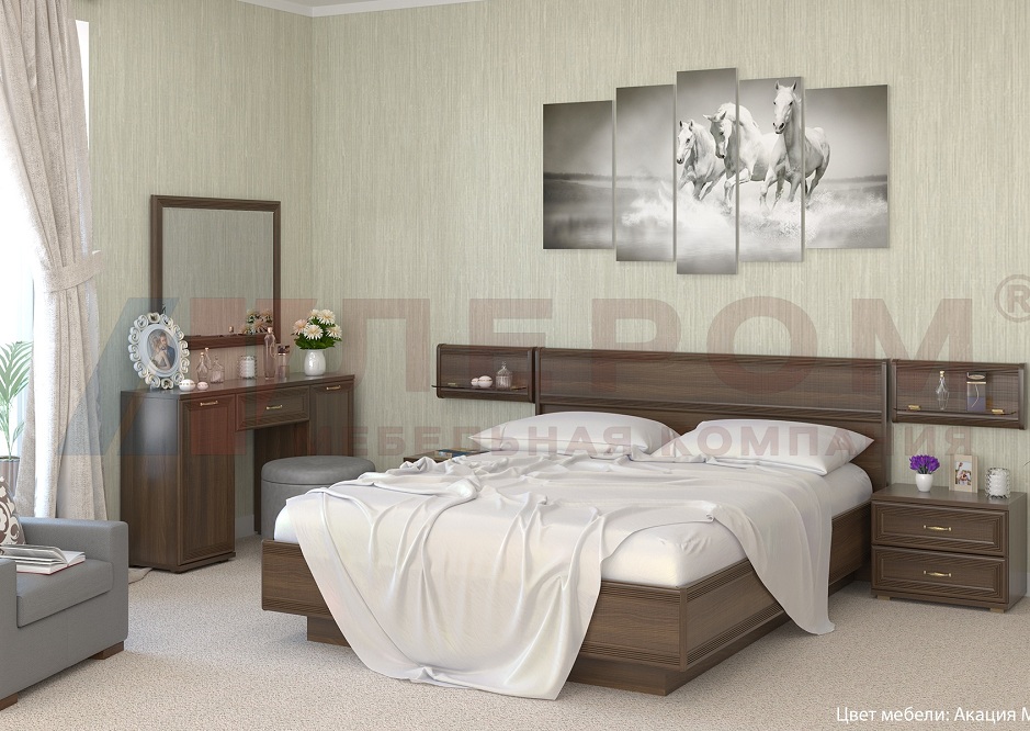 код 20637Кровать, прикроватные тумбы с надстроенными навесными полками, туалетный столик.