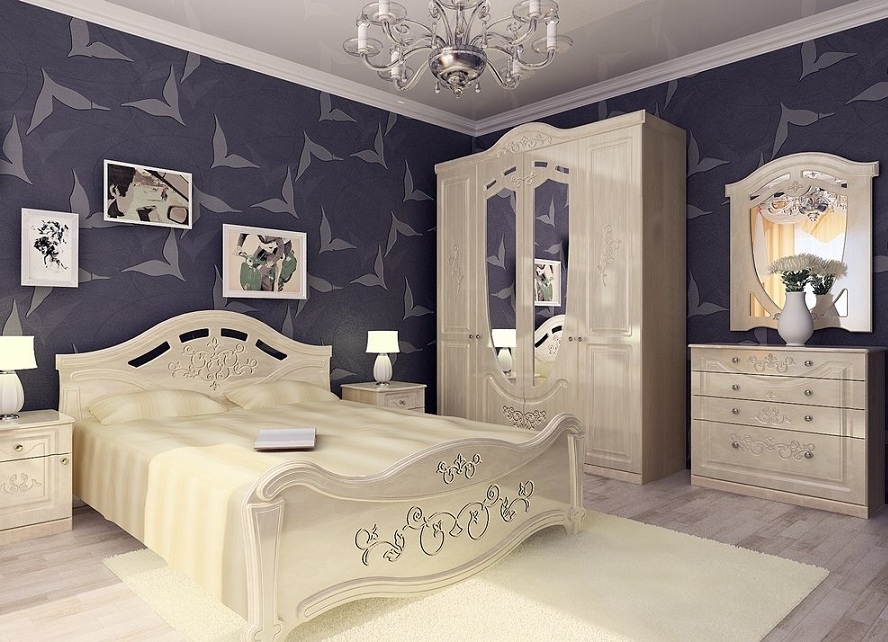 Роскошный набор мебели для спальни «Александрия» представлен в виде модульной системы, в составе которой вместительный шкаф с зеркалами, двуспальная кровать с прикроватными тумбами и комод с зеркалом в фигурной рамке. Фасады всех элементов набора украшены фрезеровкой необычными узорами, придающими мебели оригинальный вид.