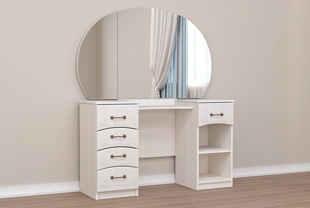 - стол туалетный. Внутреннее наполнение: слева - четыре вместительных ящика, справа - один ящик и закрытая ниша с полкой; зеркало-трюмо (1180х1440х416 мм);