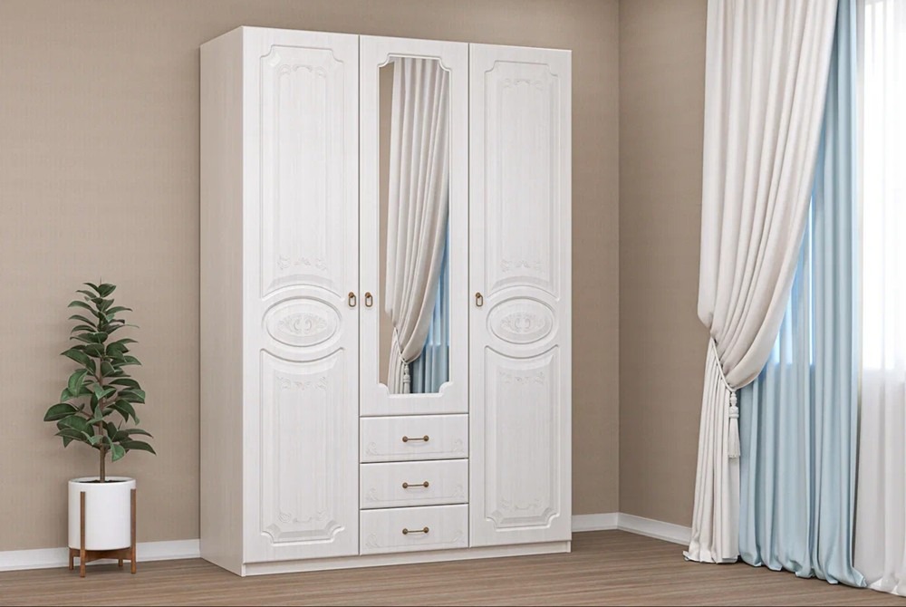 - шкаф 3 створчатый. Внутреннее наполнение: две крайние секции оснащены штангой для одежды и антресольной полкой, средняя секция - тремя ящиками на шариковых направляющих (система полного выдвижения) и тремя просторными полками (1506х2200х576 мм);
