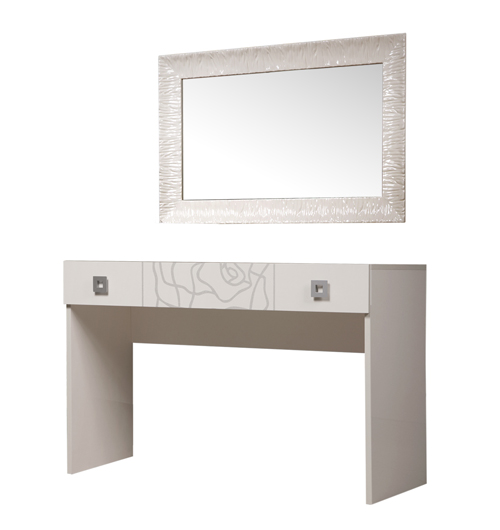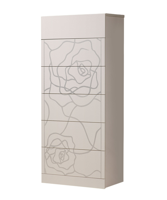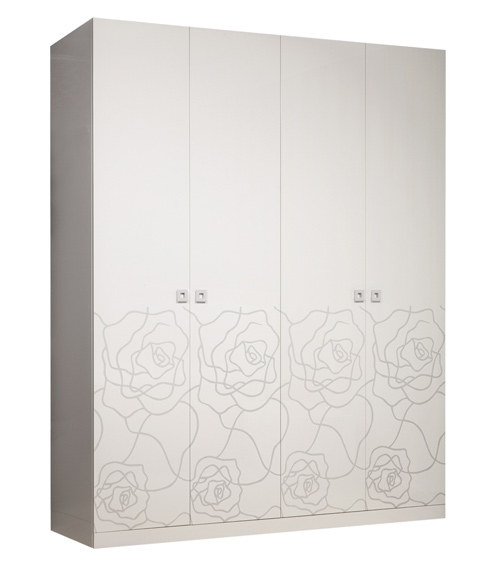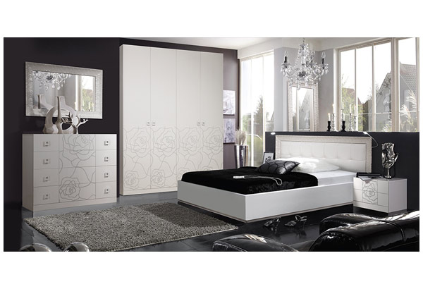 Мебель для спальни «Роза» включает в себя двуспальную кровать, шкаф для одежды, комод с зеркалом и две прикроватные тумбы. Фасады мебели декорированы узорами. Белое цветовое оформление сделает помещение визуально шире, придаст ему некую воздушность.