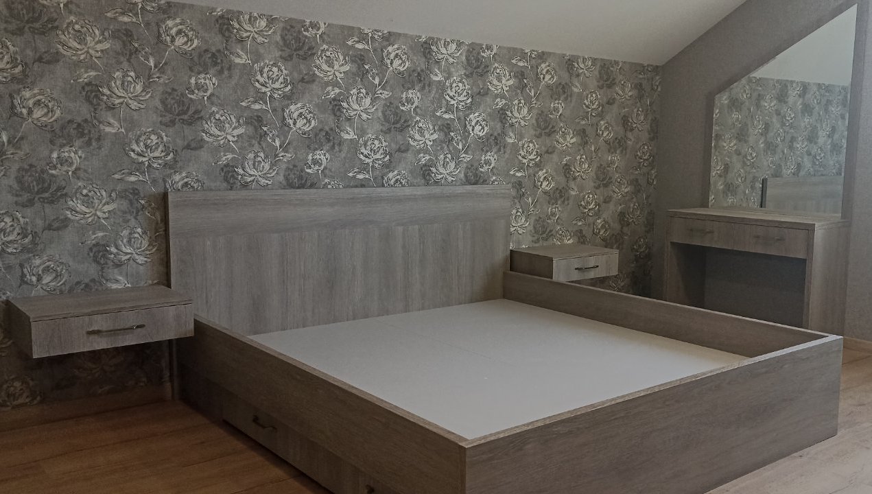 Кровать с выдвижными ящиками, шкаф-купе, комод, туалетный столик с зеркалом.