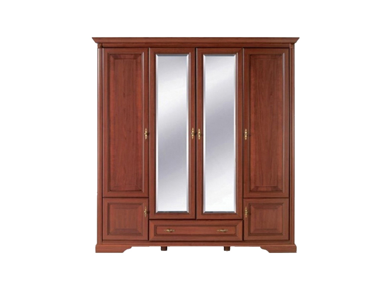 Фасады декорированы резьбой, что создает эффект визуальной объемности мебели. Центральная секция просторного шкафа застеклена, двери открываются в обе стороны.