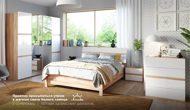 Практичный спальный гарнитур в комбинированной однотонной отделке.