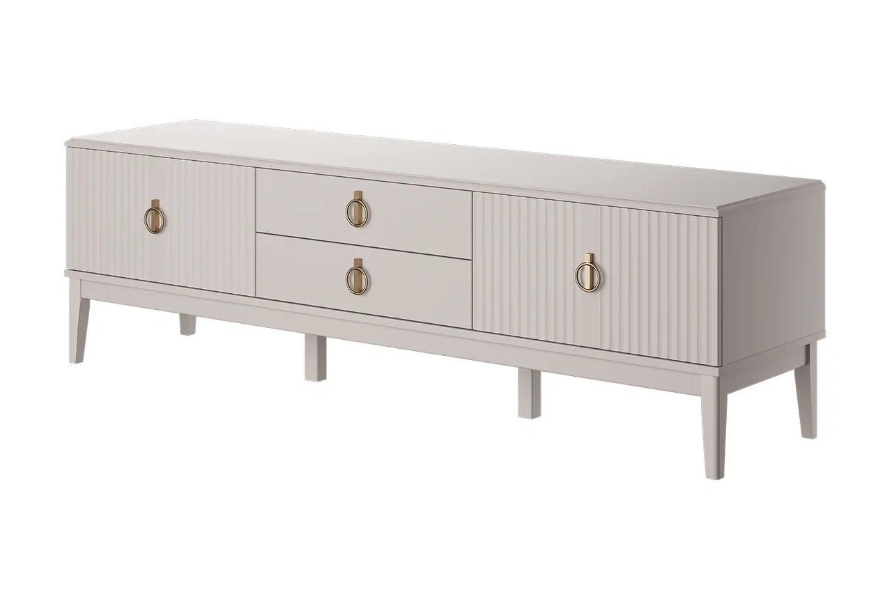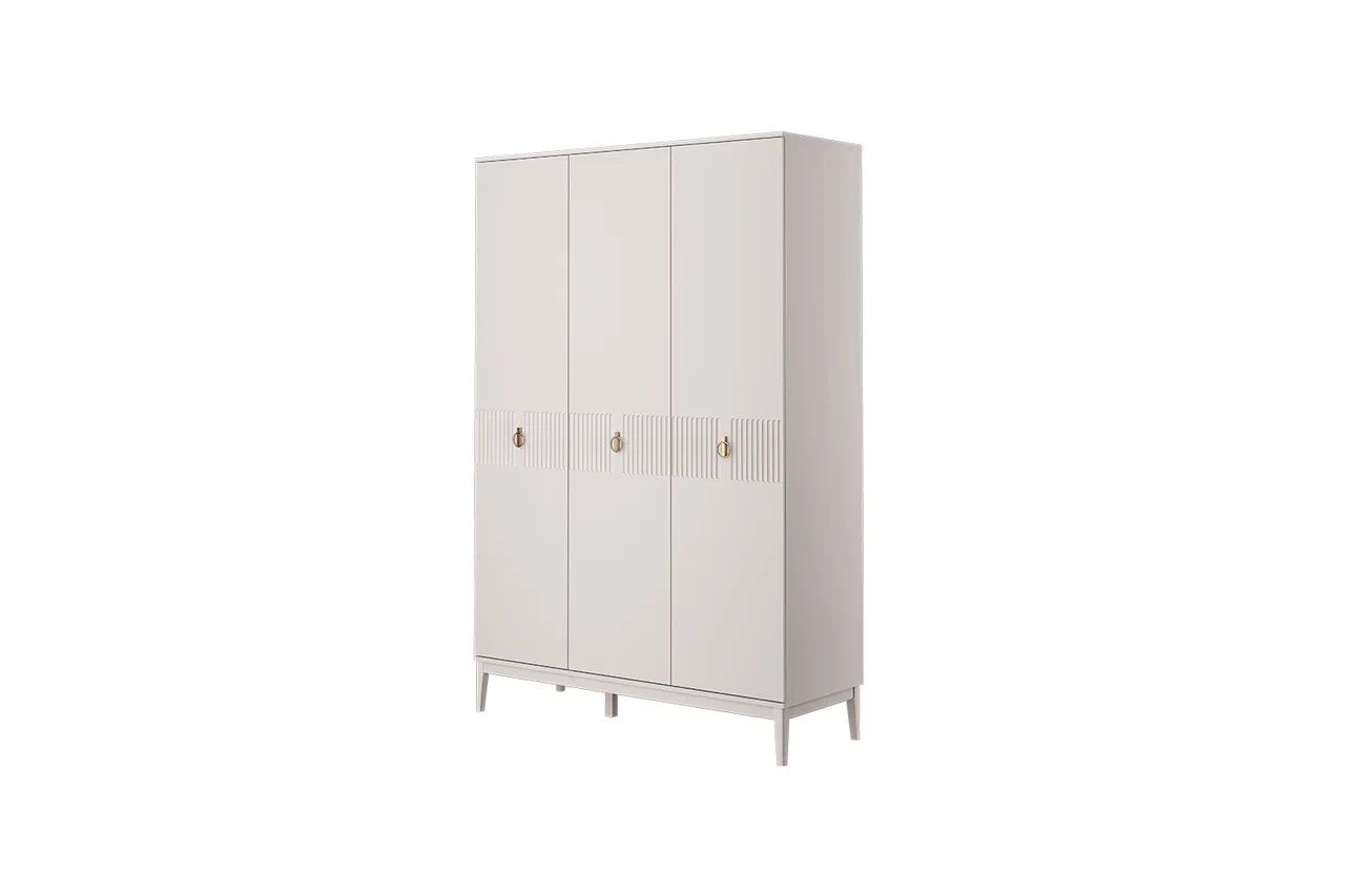 Фасады модульной гостиной «Фарго» выполнены из МДФ и покрыты эмалью льняного цвета. Корпус ЛДСП в цвете "Персидский жемчуг". Стиль коллекции задает модная вертикальная фрезеровка фасадов и оригинальная фурнитура золотого цвета. Надёжность и функциональность гостиной придают высокие опоры из массива, а стеклянные витрины сделают интерьер более светлым, легким и современным.