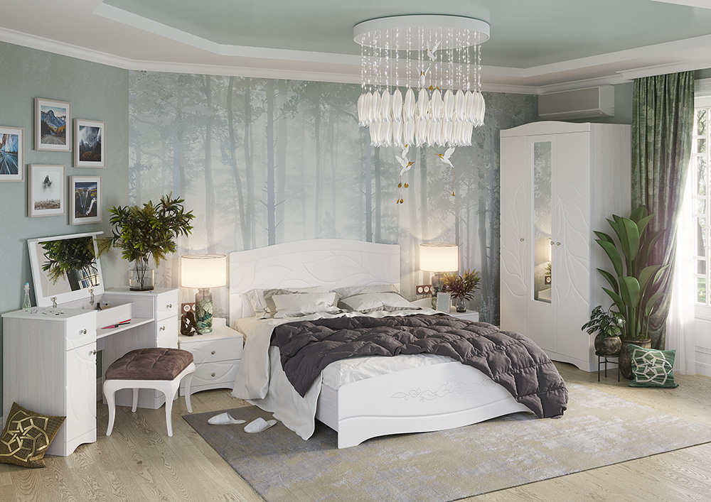 Состав комплекта: комод, шкаф, двуспальная кровать, тумба (2 шт).