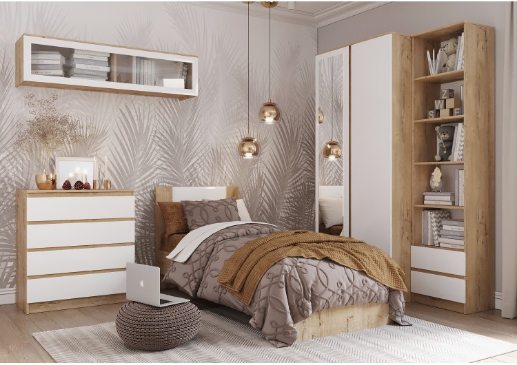 код 107555В набор входит: кровать, шкаф, стеллаж, антресоль, комод.