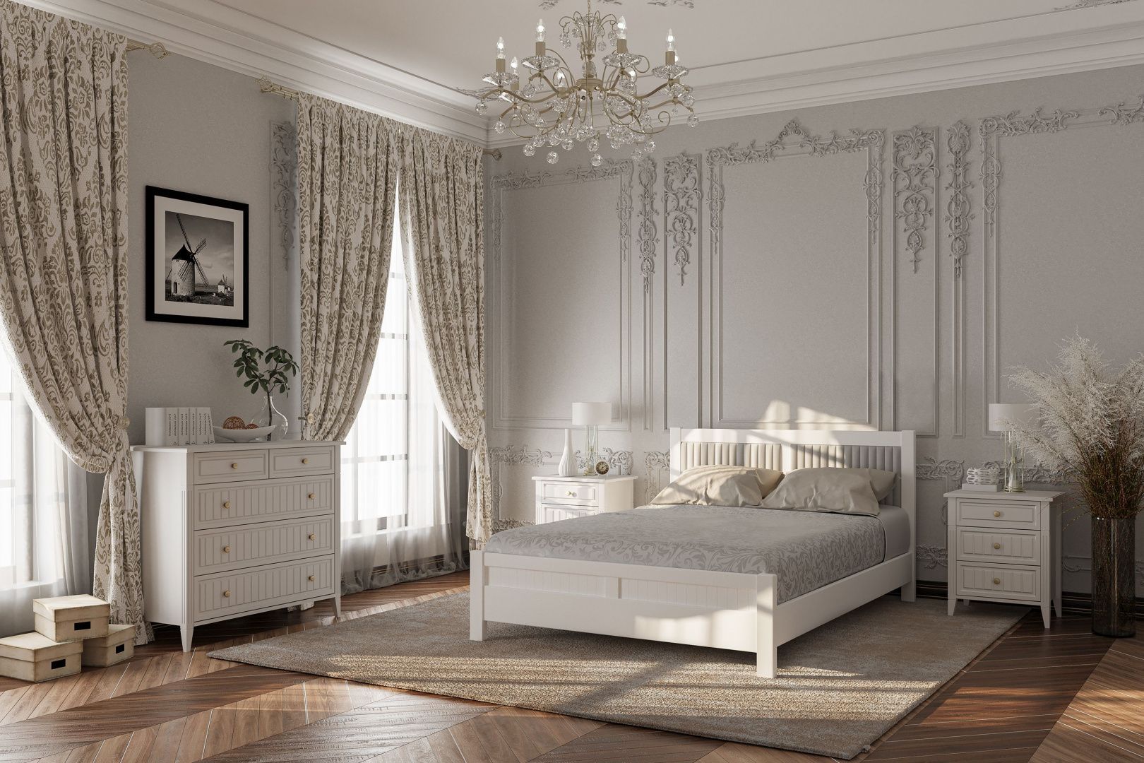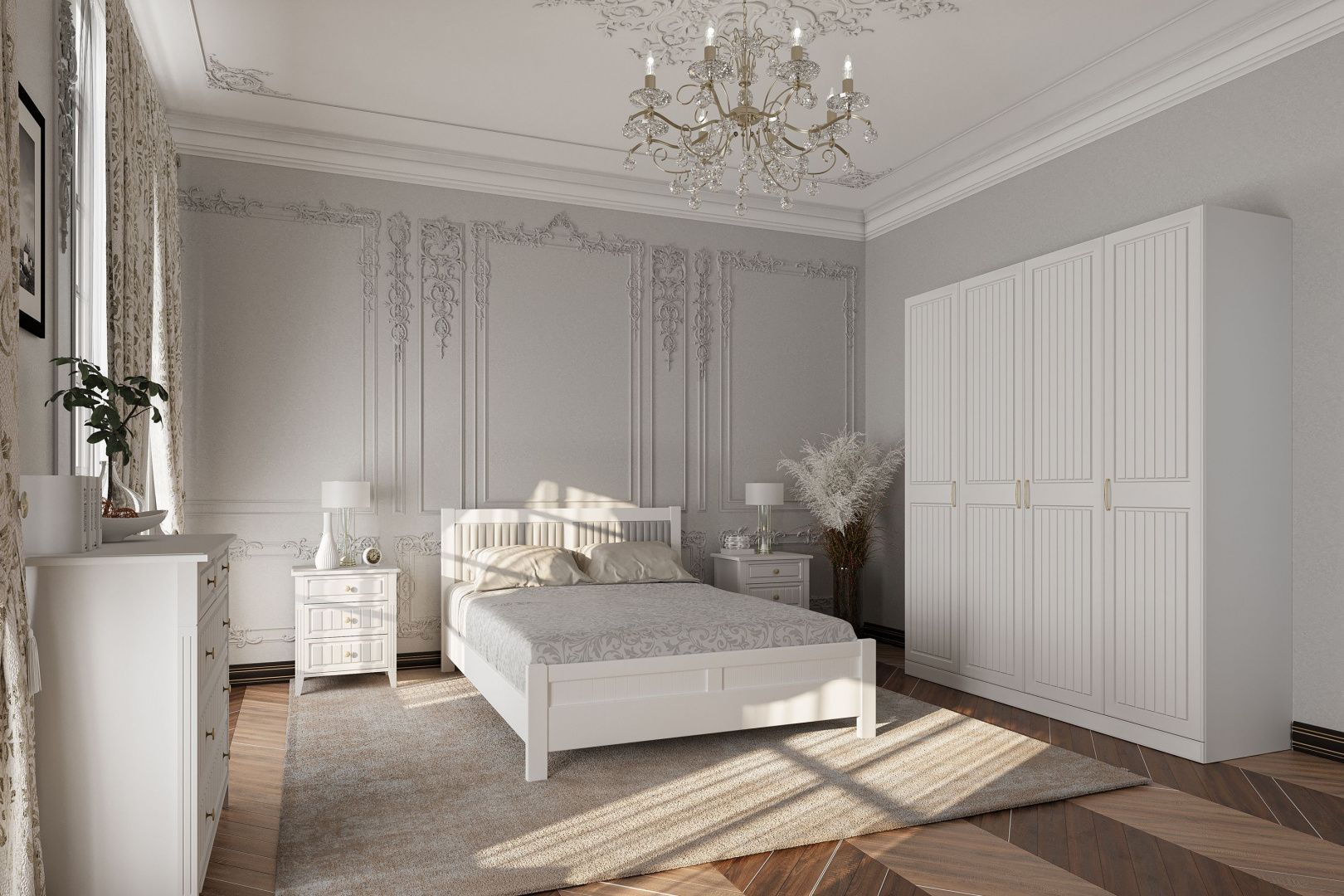Классическая спальня изготовлена из массива бука и исполнена в отделке «белый ясень».