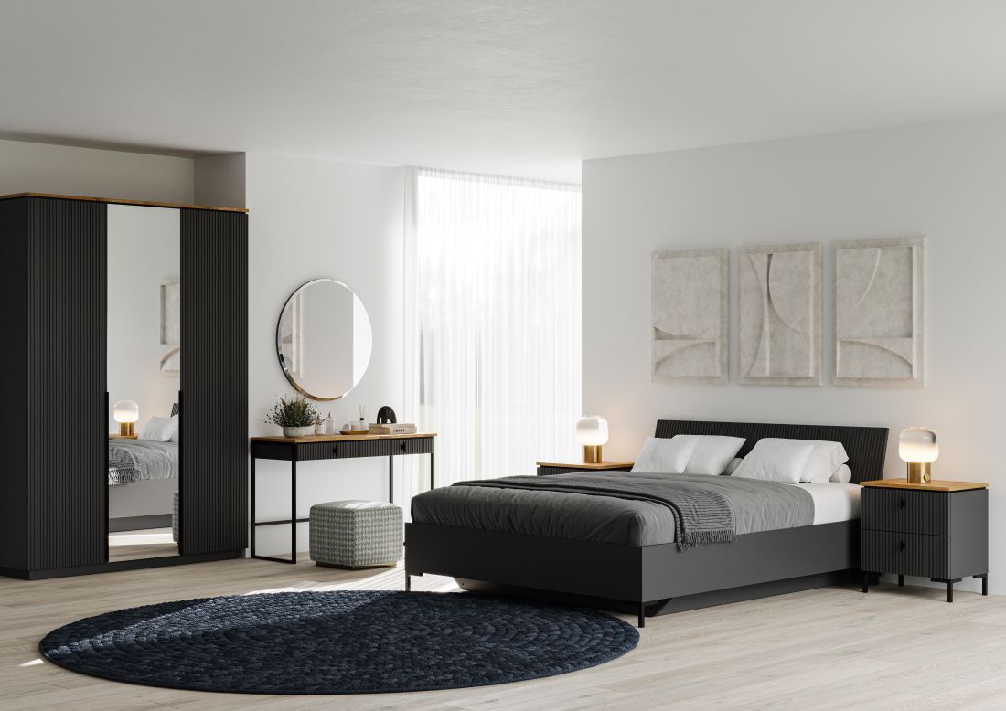 код 152022Элегантная коллекция мебели с запоминающимися рельефными фасадами в цвете антрацит. Материал: МДФ, ЛДСП.