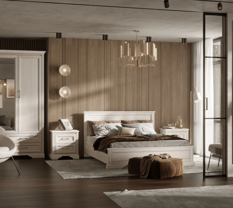 Уютная и лаконичная коллекция для спальни, располагающая к отдыху. Материал: МДФ, ЛДСП.