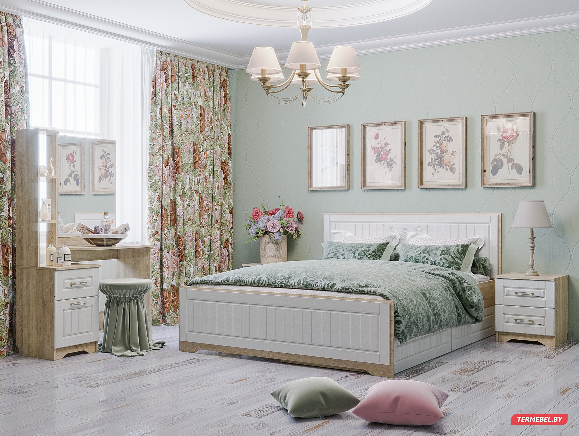Цена указана за изделие в минимальной комплектации: кровать, комод, тумба прикроватная.