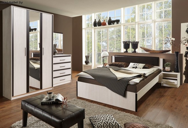 Набор мебели для спальни в комбинации двух светлых оттенков.