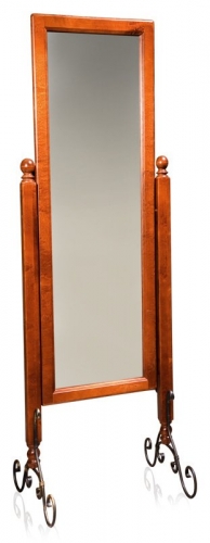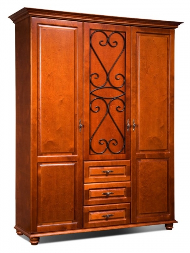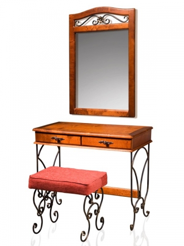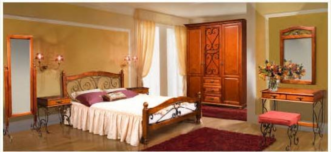 Широкая французская кровать с высокими спинками в виде арочных рам с кованными узором на резных ножках. Две прикроватные тумбы изготовлены в виде блока с выдвижным ящиком на кованной опоре. Трюмо с вращающимся зеркалом в деревянной раме на опорах из художественной ковки. Трехстворчатый шифоньер с филенчатым фасадом, центральная створка верха украшена ковкой, под которой расположены три шуфлядки. Туалетный столик с мягкой банкеткой также изготовлены на ажурной кованной опоре, под столешнице вмонтированы два выдвижных ящика для бижутерии и косметики. Навесное зеркало в прямоугольной раме с декорированным рамным навершием.