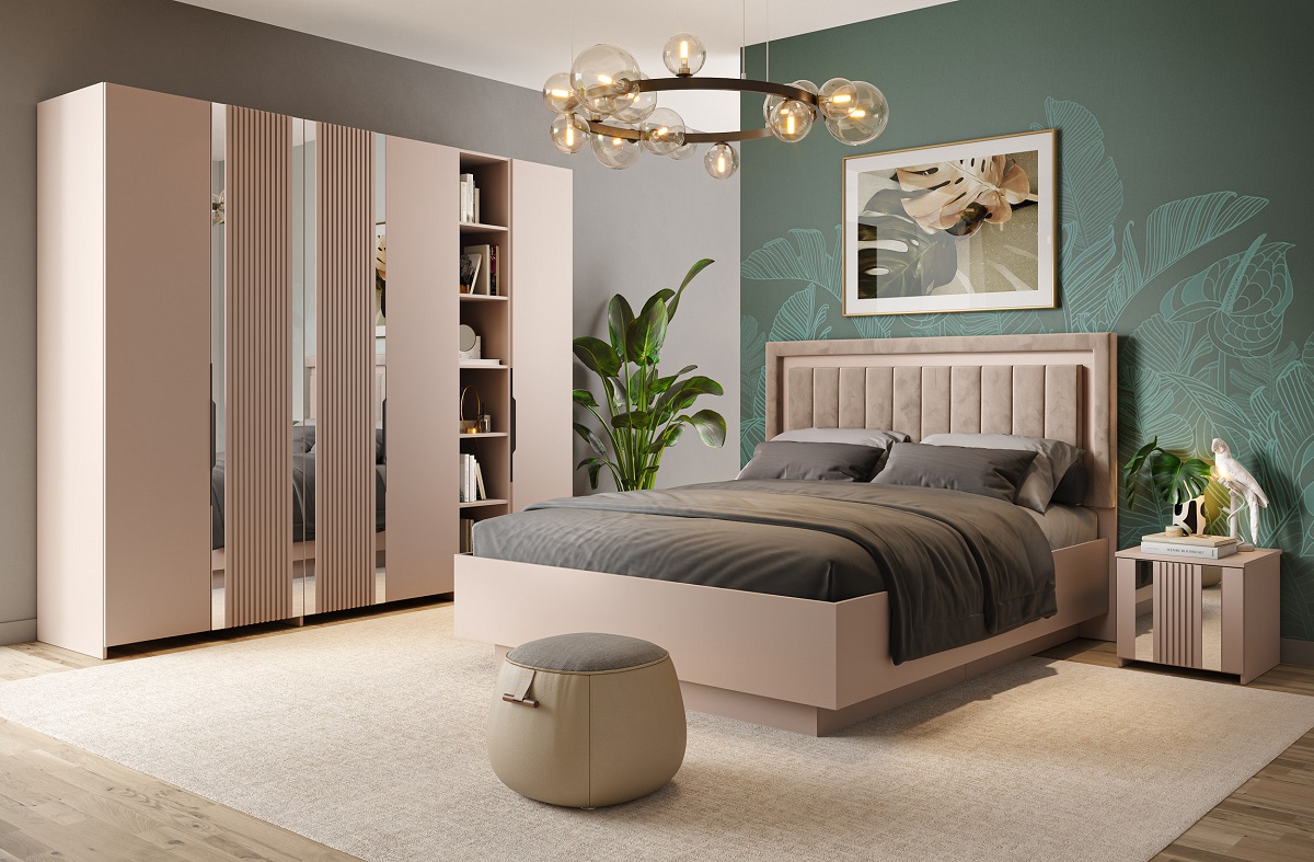 Изысканная модульная коллекция для спальни. Включается в себя кровать, две тумбы, комод и 3ств шкаф.