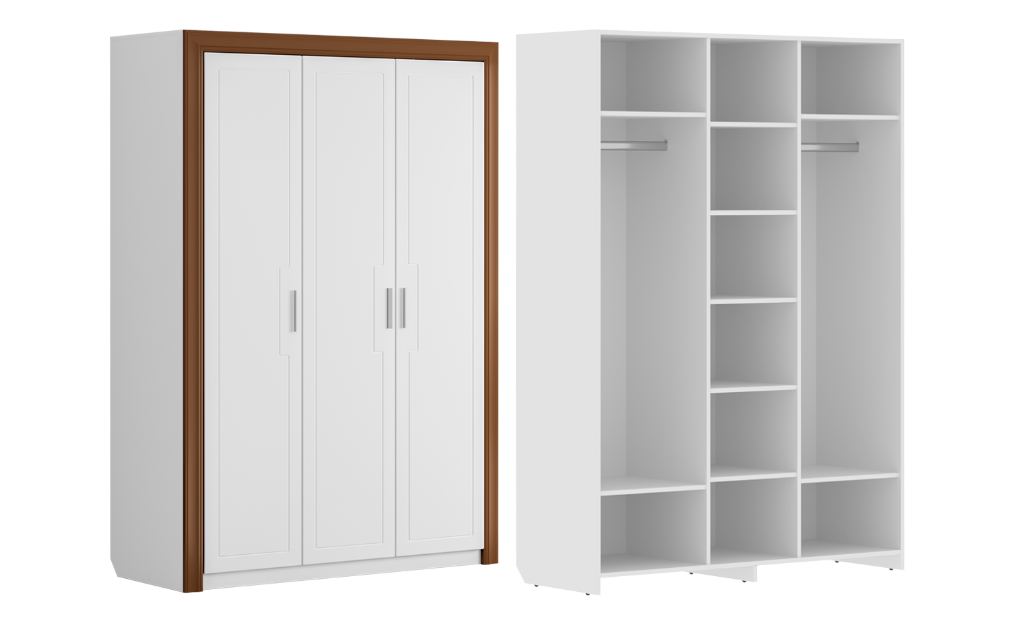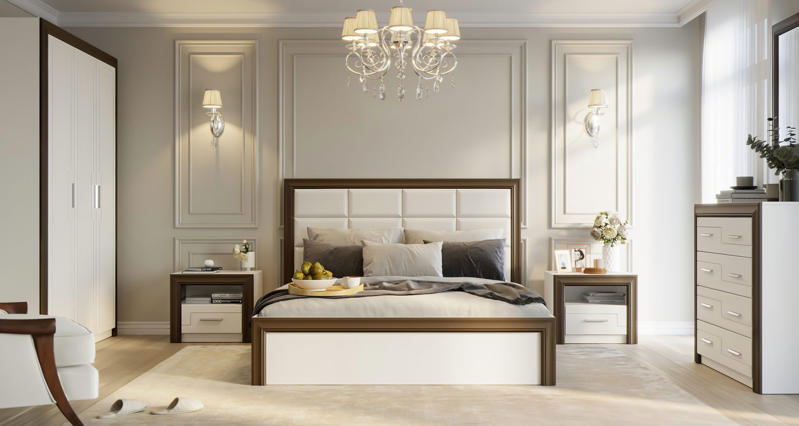 Коллекция в сдержанном классическом стиле для спальни. Материал: ЛДСП, профиль МДФ.