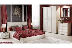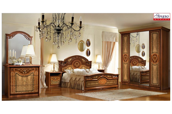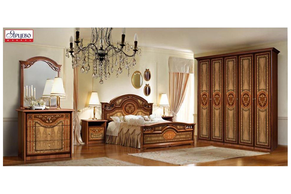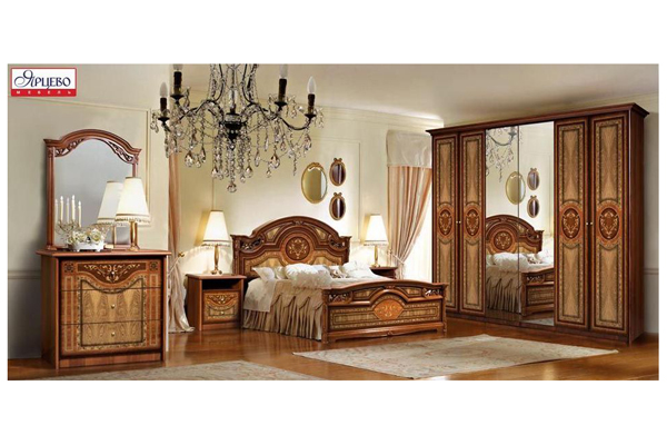 Образец роскоши и богатства в данном комплекте представлен широкой двуспальной кроватью, четырехстворчатым шкафом со встроенным зеркалом, двумя прикроватными тумбочками и комодом. Комод также оснащен зеркалом, для создания дополнительного комфорта. Сохранить чудесный внешний вид данному комплекту помогает отделка фасадов, украшенная оригинальным рисунком и фурнитурой.