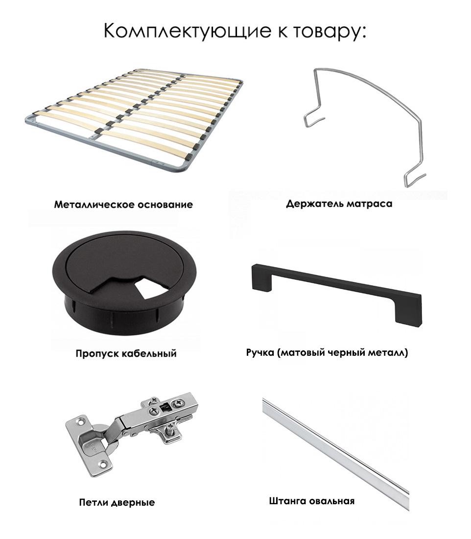 Фурнитура: ручка металлическая черная матовая, шариковые направляющие, опора мебельная, штанга овальная, петли дверные, держатель для матраса, металлическое основание с ламелями для кровати.