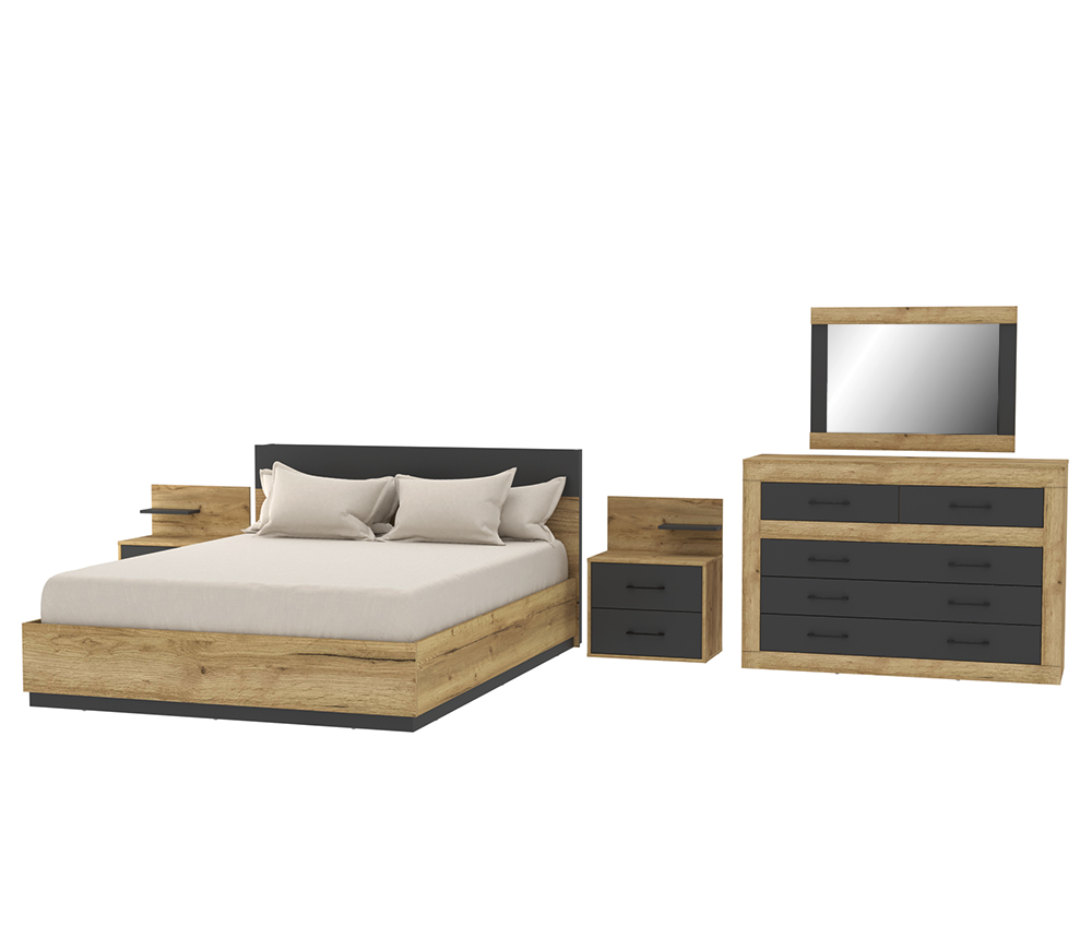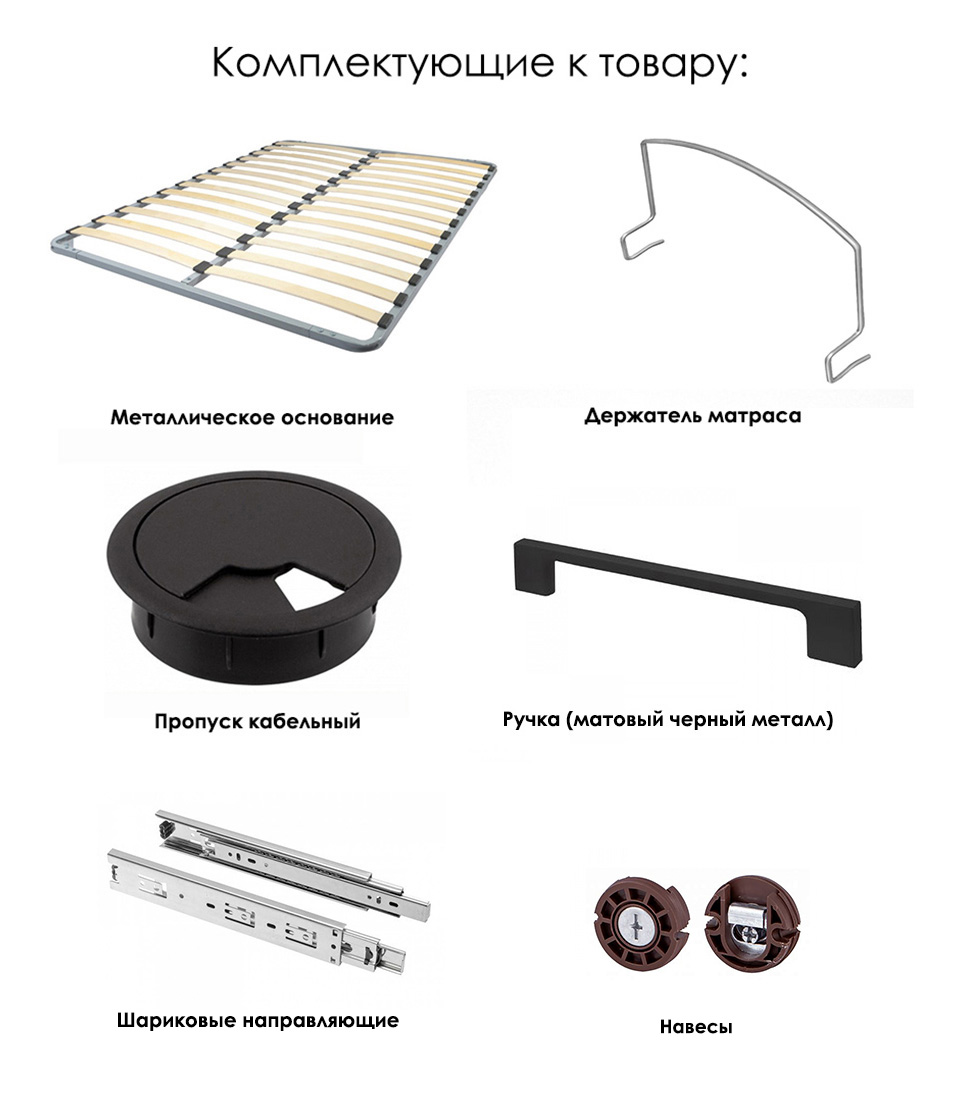 Фурнитура: ручка металлическая черная матовая, шариковые направляющие, опора мебельная, навесы, держатель для матраса, металлическое основание с ламелями для кровати.