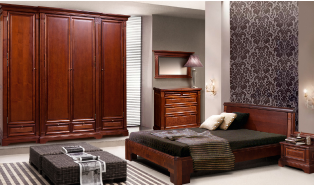 Стильный спальный гарнитур «Престиж-8.2» ГМ 5980-01 в темной приятной расцветке с с интенсивной текстурой дерева ольхи. Фасады гармонично украшены карнизами и рамами со вставками резьбы по дереву. В комплект входит комод на несколько шуфляд, широкая двуспальная кровать с прямоугольным изголовьем, открытым низом и открытым матрасом. Также имеется шкаф на четыре секции с распашными створками.