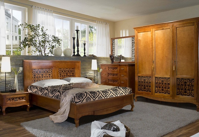 В комплекте: шкаф, кровать, комод, прикроватные тумбы.