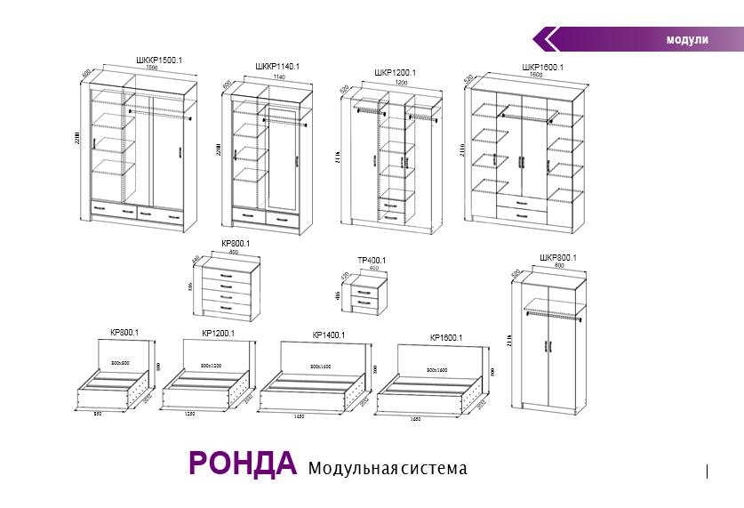 Набор мебели для спальни "Ронда" имеет модульную комплектациюи может состоять из следующих элементов:
