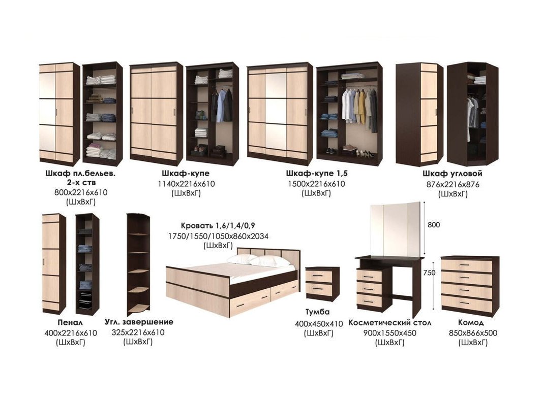 Набор мебели для спальни "Сакура" имеет модульную комплектацию и может состоять из следующих элементов: