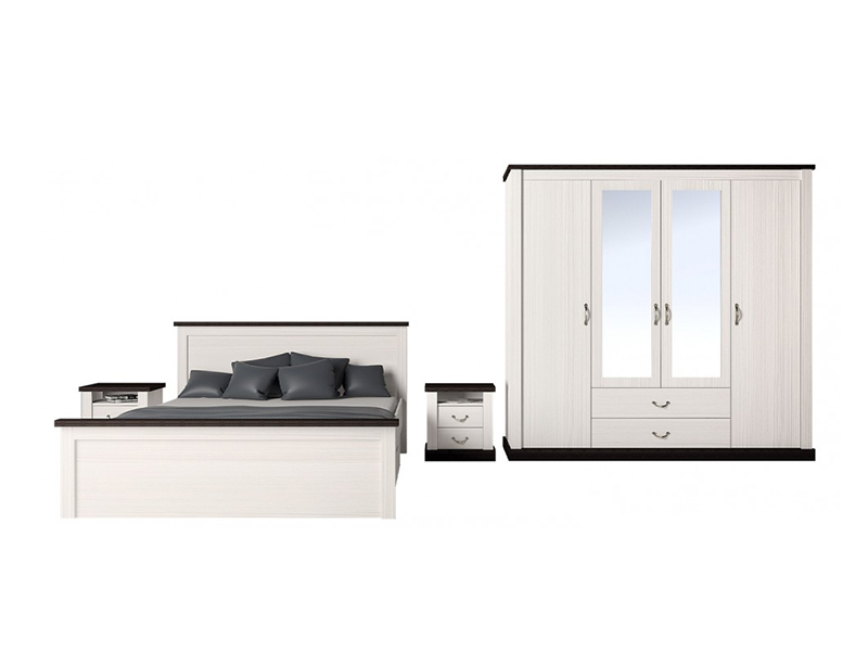 Полный комплект: шкаф, кровать двуспальная, комод, две прикроватные тумбы.