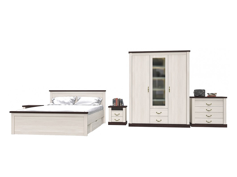код 120650Набор мебели состоит из кровати, тумб, шкафа с зеркалом и комода.