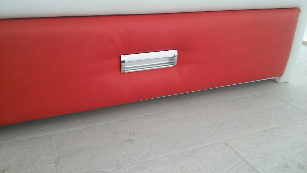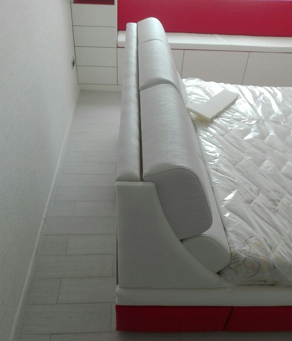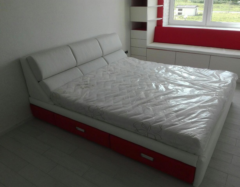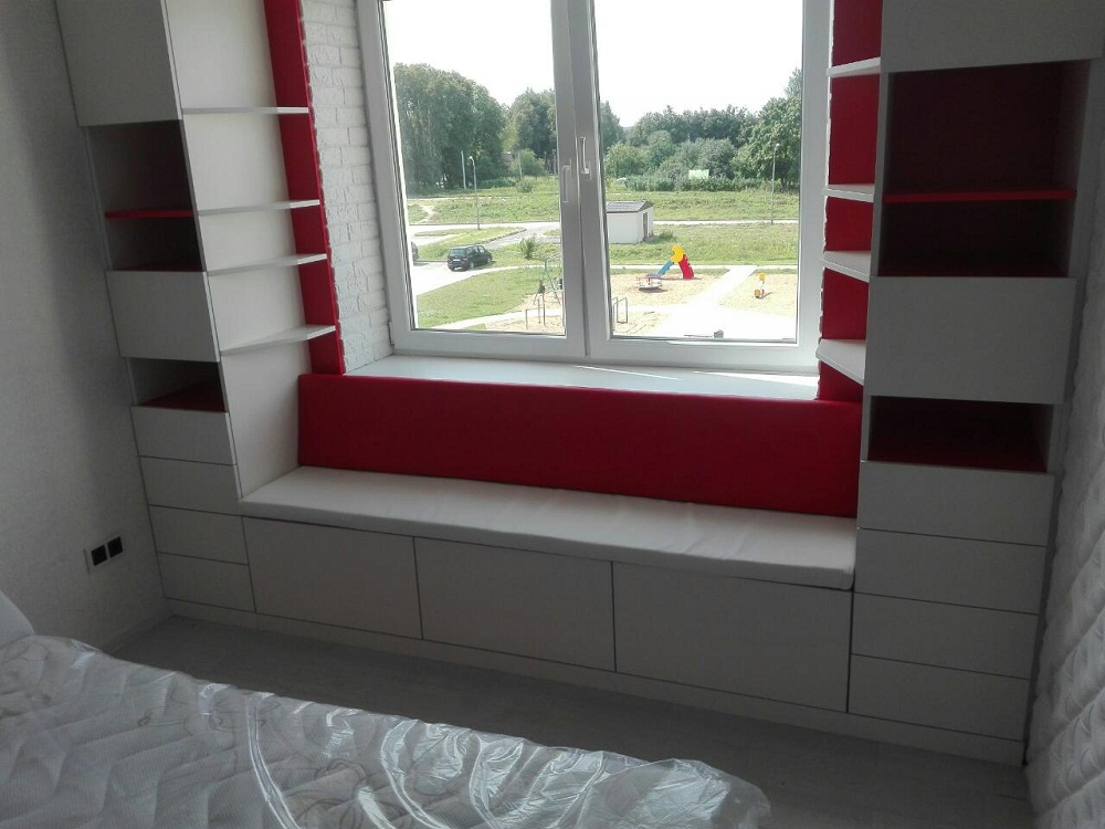 код 91776Кожаное изголовье с удобным наклоном. Приоконный комод-банкетка с пеналами.