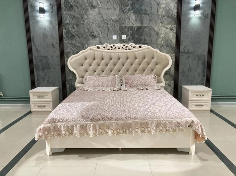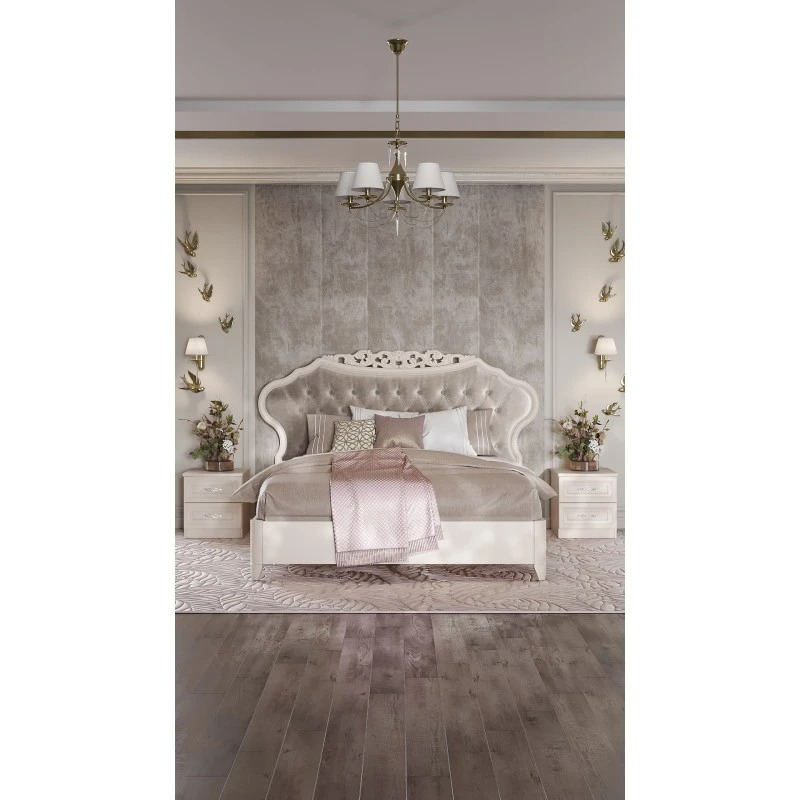 Cпальня Адель 1,8 Цвет: Бежевый Спальный гарнитур «Адель» – это не только непревзойдённый комфорт, но и великолепное исполнение всеми любимой классики. Изголовье - индивидуальная особенность Адель. Его утончённые изгибы венчает витиеватый, но сдержанный узор лепнины, придавая кровати законченный вид. Универсальный бежевый оттенок спальни подойдёт к любому интерьеру и создаст в пространстве комнаты настроение уюта и покоя. Предметы коллекции спальни Адель: кровать: 1.8 ш 2256 / г 2068 / в 1460 с подъемным механизмом тумба прикроватная: ш 462 / г 508 / в 504 шкаф 5 ств: ш 2366 / г 634 / в 2200 комод: ш 1012 / г 542 / в 879 пуф: ш 416 / г 416 / в 416 зеркало: ш 997 / в 697 Любой предмет из набора мебели можно приобрести отдельно.
